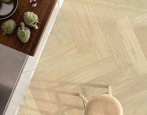Il nuovo pavimento Pergo a spina di pesce in vinile della collezione Vorma è forte e resistente agli urti, ma in contemporanea morbido da calpestare.